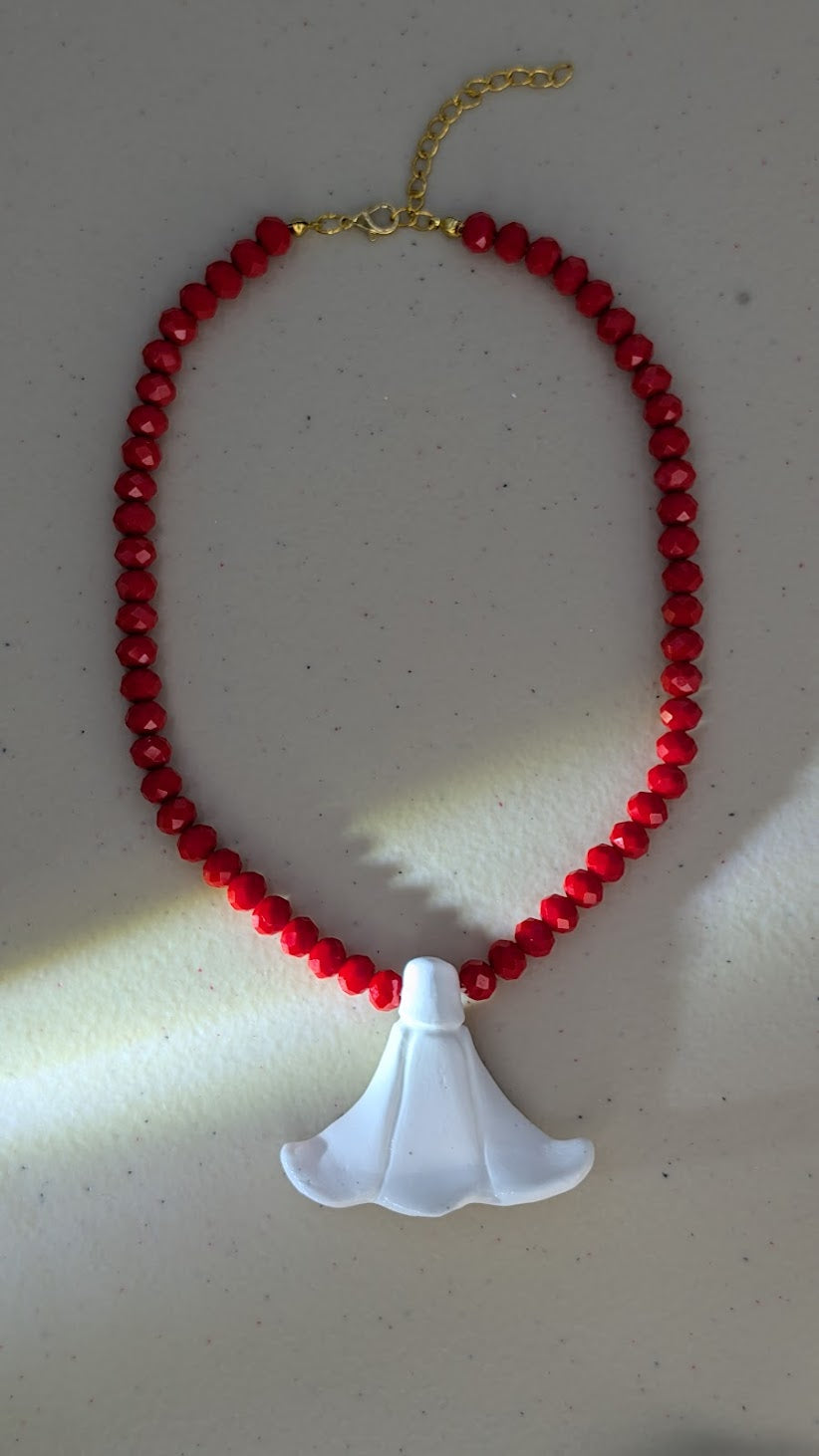 Dramatic fire red crystal beads with sculpted porcelain petal, designed for those who wear confidence as jewelry.