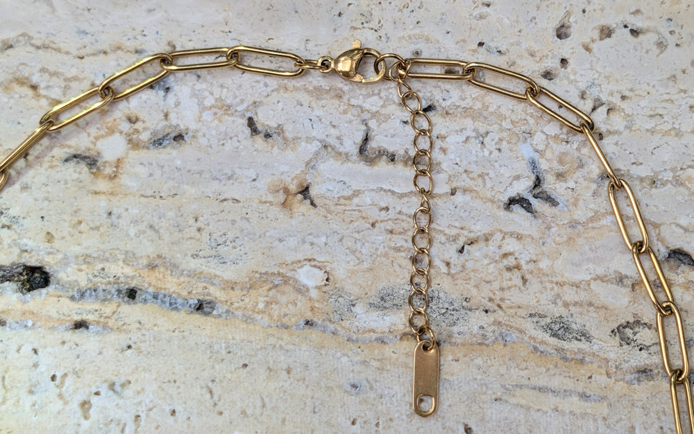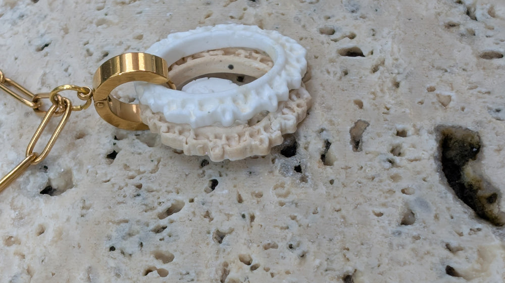 A transformable gold chain necklace with interchangeable porcelain pendants. Wear it with a full stack, a single charm, or simply as a sleek chain.