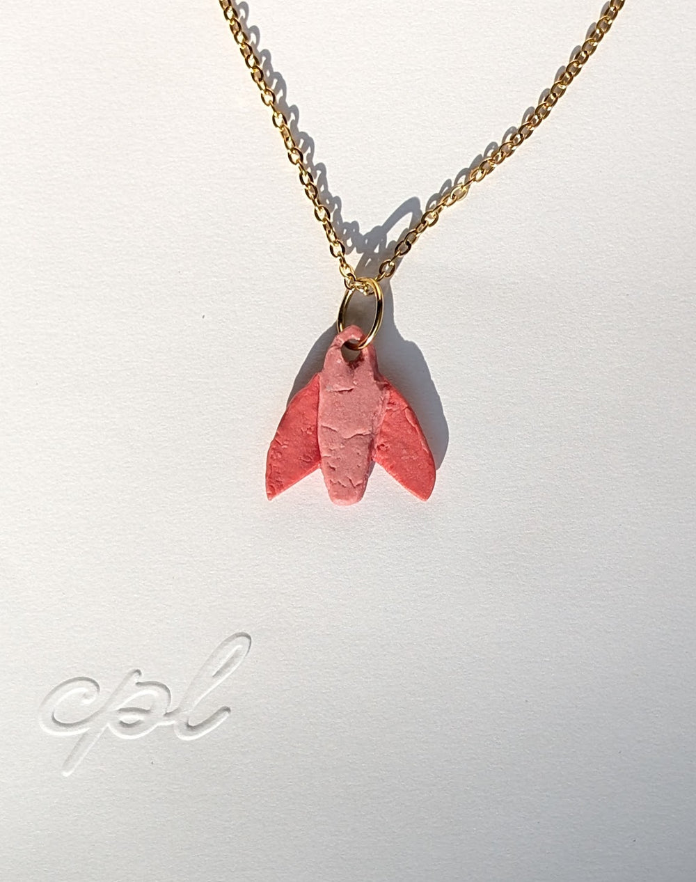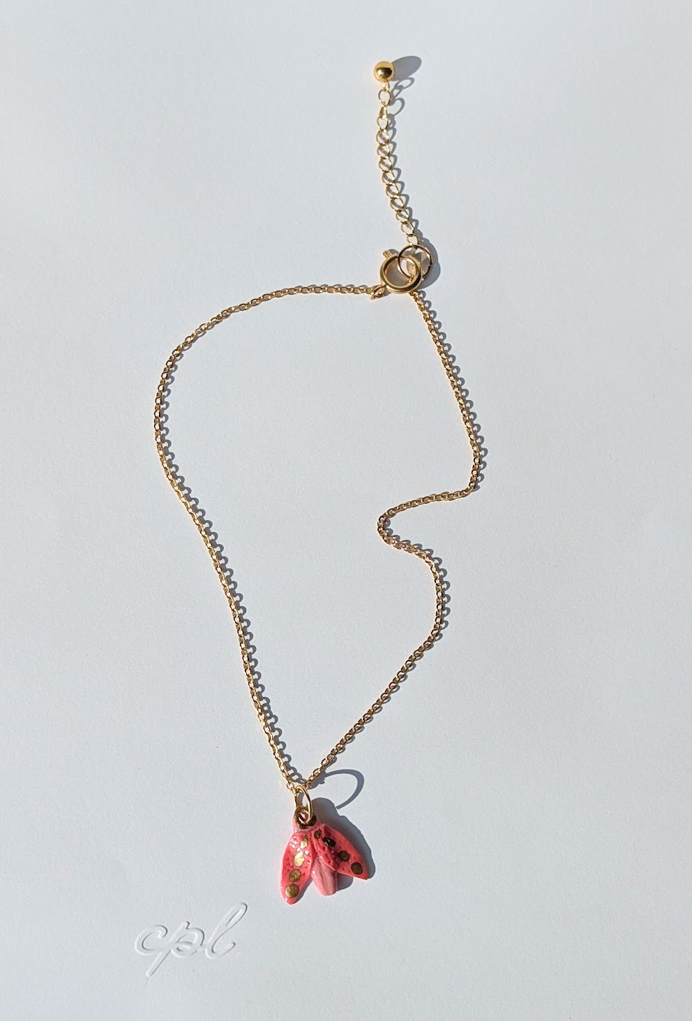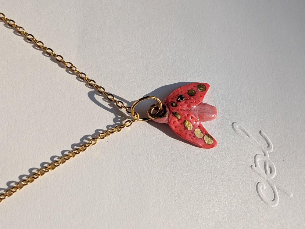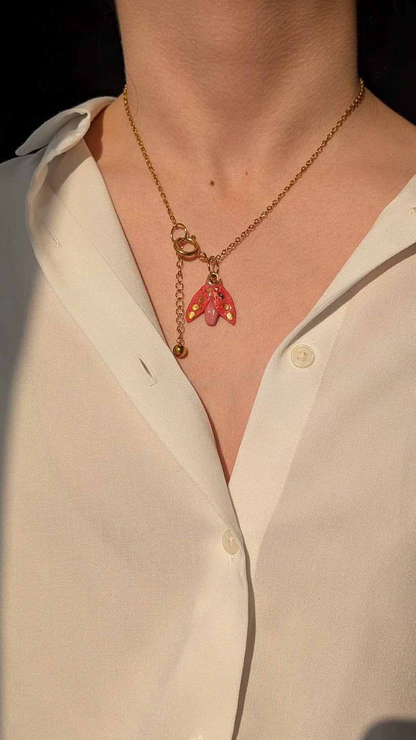 Pink porcelain Moth. Hand-sculpted and glazed in a warm rosy pink, the pendant is dotted with subtle touches of 12% liquid gold that catch the light like pollen on wings. There’s a gentle asymmetry to the form - not decorative, but alive - a reminder that this piece began as soft clay shaped by hand, not a mold.