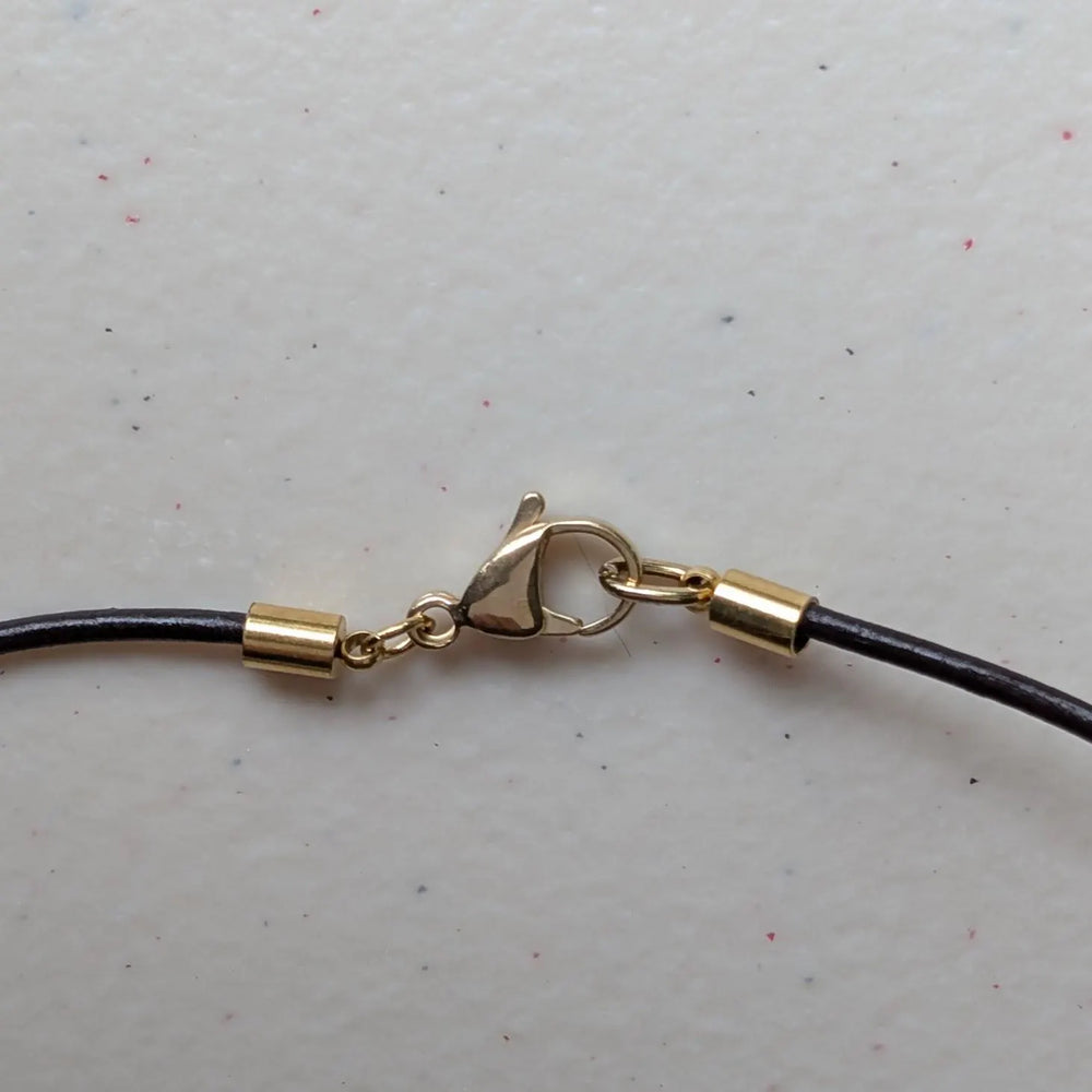It hangs on a smooth dark leather cord and finished with stainless steel clasp, accented with two stainless steel charms in gold and silver tones.