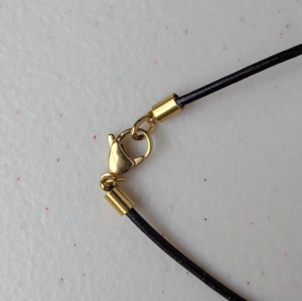 It hangs from a soft dark leather cord, secured with a stainless steel clasp for durability and a subtle metallic accent.