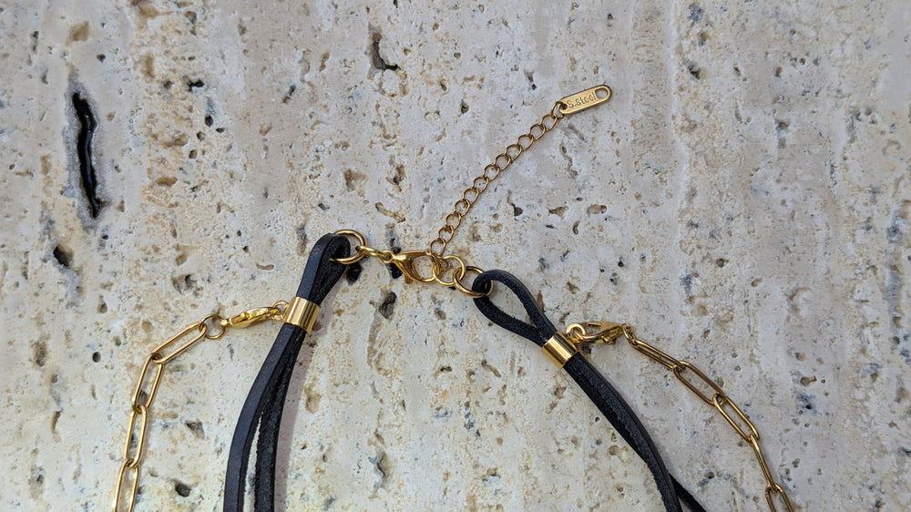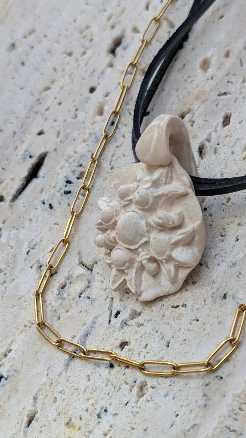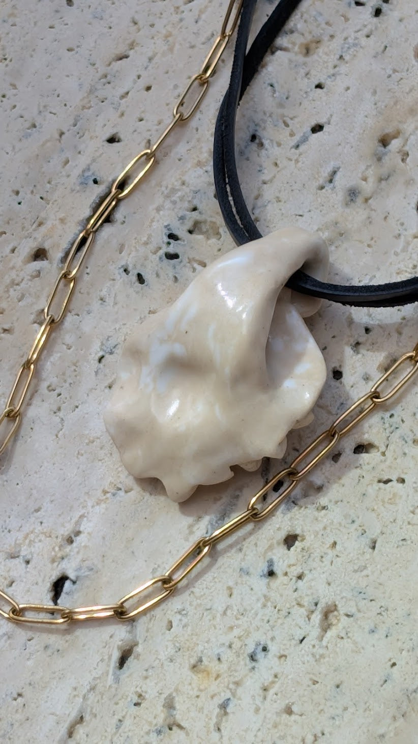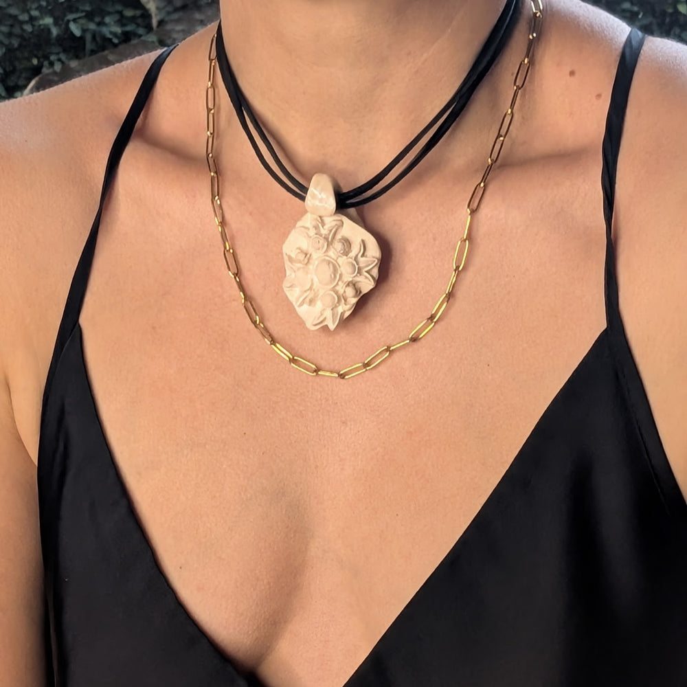 Textured ceramic pendant with layered leather cords and stainless steel chain.
