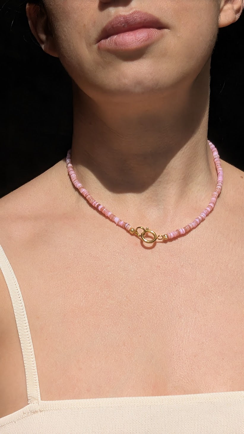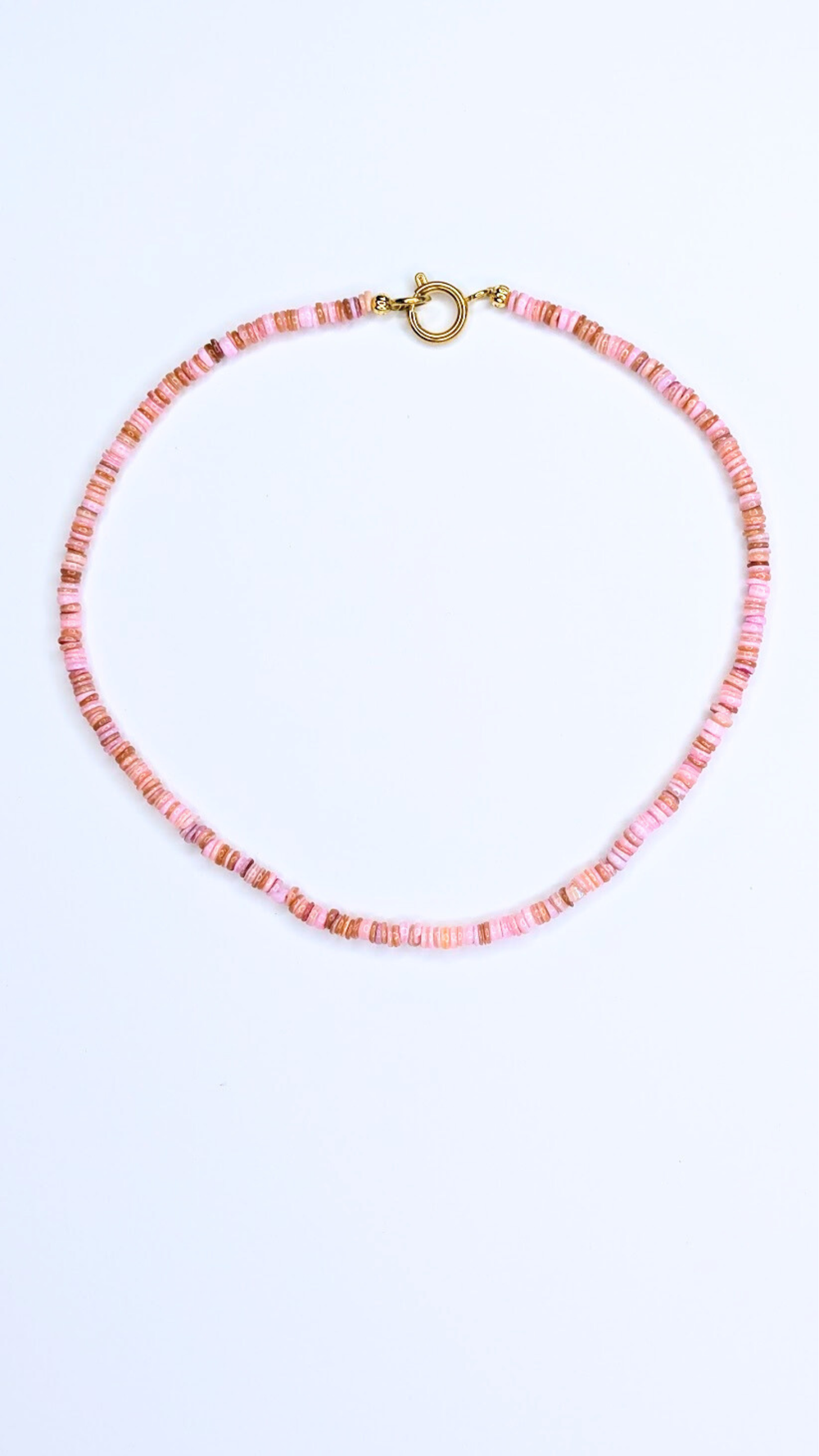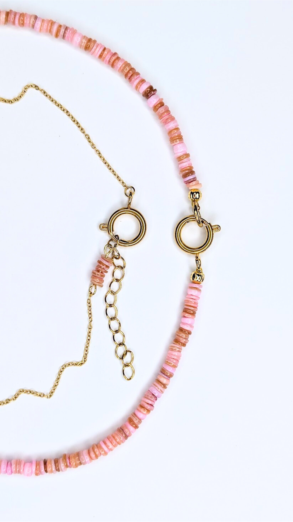 The first necklace is made from natural shell beads in varied blush-to-rose pink tones, each bead slightly different in hue and thickness, creating an organic, beach-worn rhythm around the neck. Finished with gold-tone stainless-steel clasps for a cool, durable closure.