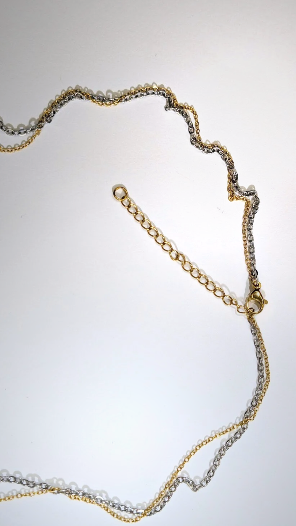 It hangs from a mixed-tone double chain (gold + silver), giving you that intentional “I meant to do this” layered look in one piece - no stacking math required.