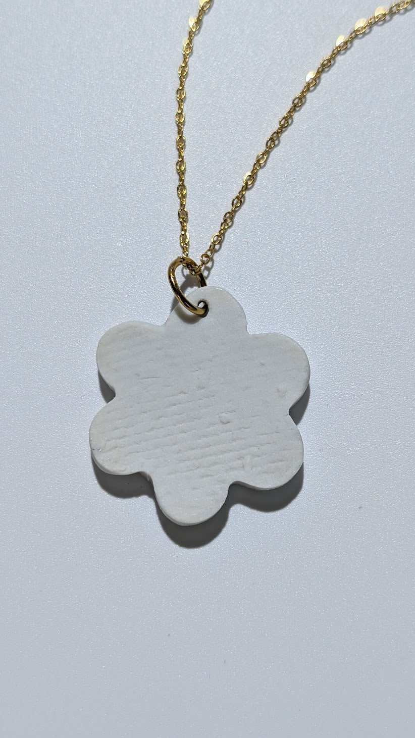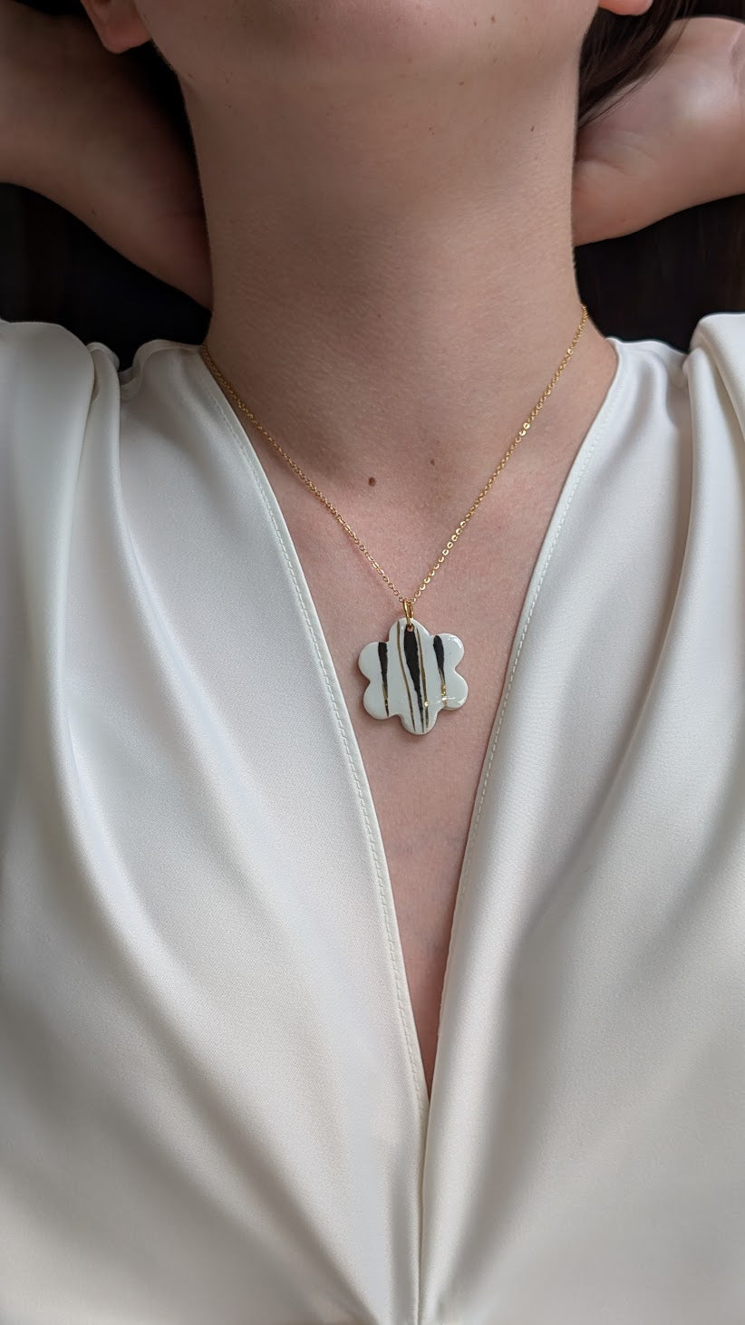 Sculptural porcelain pendant shaped like an abstract flower, finished in transparent glaze and hand-painted with bold black strokes and fine lines of 12% liquid gold.